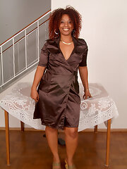 Ebony MILF Theresa Long slides out of her elegant dress to spread