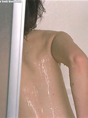 Vanessa Bush slides off her red robe and black lingerie before getting in the shower. She soaps up and lathers her body in soap, and then finds her dildo. She masturbates and orgasms in the shower too.