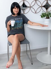 Ivy Addams is sitting at her table enjoying her tea. She enjoys showing off her figure and her hairy body. She first shows off her hairy legs and then she shows her hairy pussy and pits all nude.