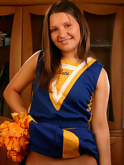 Pretty brunette cheerleader takes off panty and poses on the floor