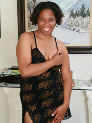 Ebony older mom takes off black dress and poses on the floor