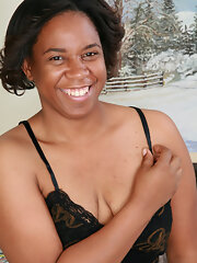 Older ebony babe exposes her curly hairy pussy