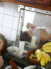 Chrystal Mirror is relaxing in her kitchen and eating a sexy banana. She starts stripping naked, and dancing on her kitchen counter. She has natural 32D breasts, and quite a beautiful hairy pussy.