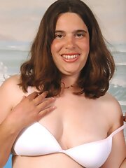 Curly brunette mature babe shows her small tits and hairy pussy