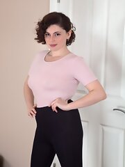 Elouisa is sitting in her armchair, and takes off her purple dress. Once she takes off her lingerie, she shows off her petite natural body. She has 36DD natural breasts and quite an inviting hairy bush.
