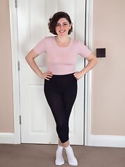 Romy is doing her workout in her pink top and black tights. She shows off her flexible figure and then strips naked. She spreads her legs, shows off her natural breasts and then her full hairy pussy.