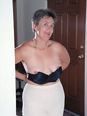 Shorthaired mature babe takes off dress and shows hairy pussy