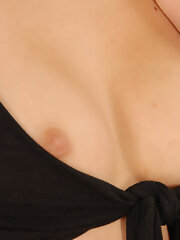 Sammy is beautiful in her yellow dress and strips naked in her bedroom. Her lingerie comes off in bed, and she shows off her 32C breasts and hairy pussy. She touches it all over and enjoys playing.