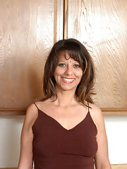 Brunette older mom takes off dress and poses naked in the kitchen