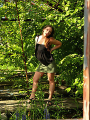 Maria F is outdoors in her pretty dress and showing off her body. She strips off her dress and shows her floral lingerie She takes it all off and poses naked in the sun and showing us her hairy pussy.